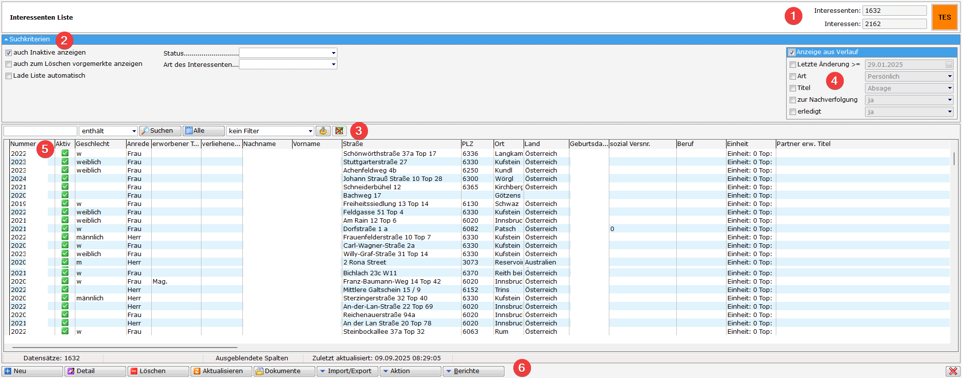 Die Interessentenliste wird in folgenden Bereichen aufgeteilt: